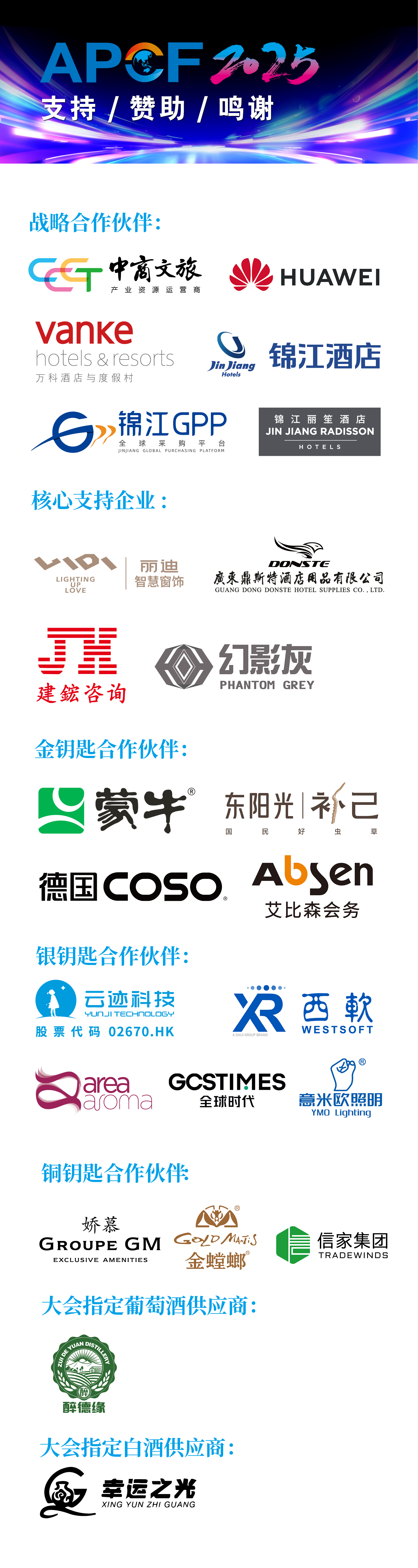 2025APCF由联合国开发计划署、世界旅游组织支持,亚太酒店与地产合作论坛组织委员会主办,锦江国际酒店股份有限公司、锦江全球采购平台、华为鸿蒙智家、万科酒店与度假村联合承办,中商文旅执行承办。